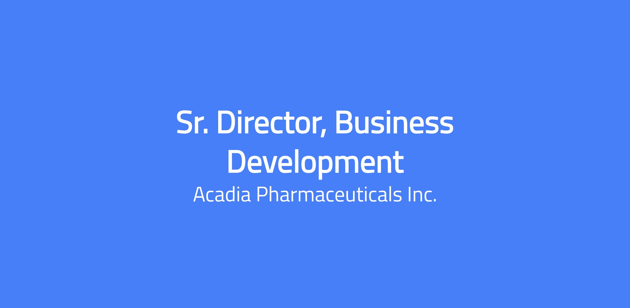 The Senior Director, Business Development will partner with External Innovation, Commercial, Legal, and Finance to identify and evaluate external assets to enhance Acadia's portfolio. The role leads a team and collaborates with executive management to implement corporate BD strategies, targeting in-licensing, asset acquisitions, strategic collaborations, and company acquisitions, requiring a strong deal sheet and a proven track record of completing transactions in biopharma. This position reports to the Vice President, Business Development. The role can be based in San Diego, CA or Princeton, NJ, with a hybrid schedule requiring in-office three days per week on average.