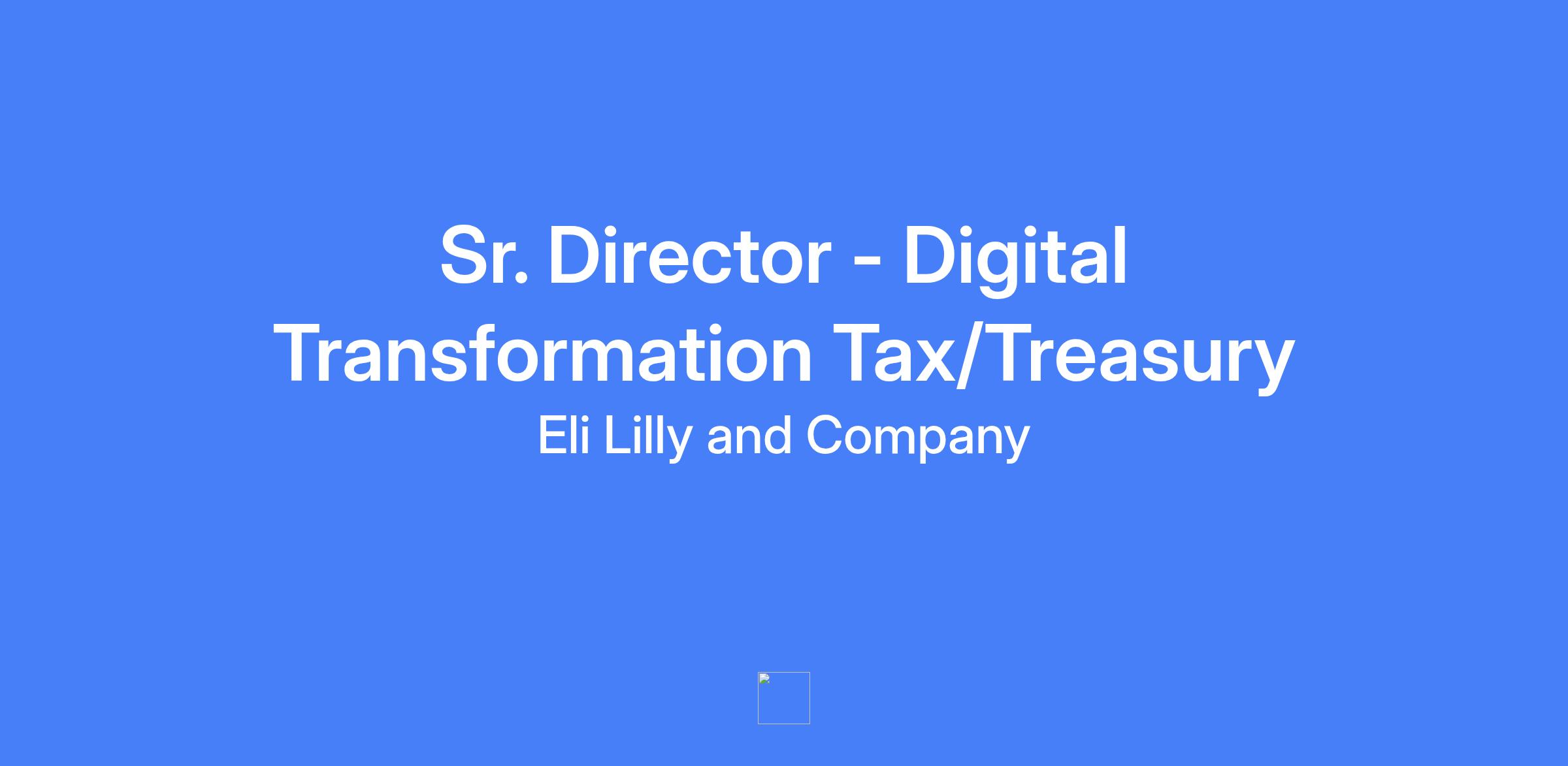 Sr Director Digital Transformation Tax/Treasury at Lilly. The role leads modernization of global tax and treasury functions, bridging technology with finance to drive digital transformation, automation, AI-driven forecasting, and intelligent workflows. It supports global, federal, state tax, global treasury, pension and benefits management, insurance and risk management, and business development financial support, with upward exposure to senior finance leaders.