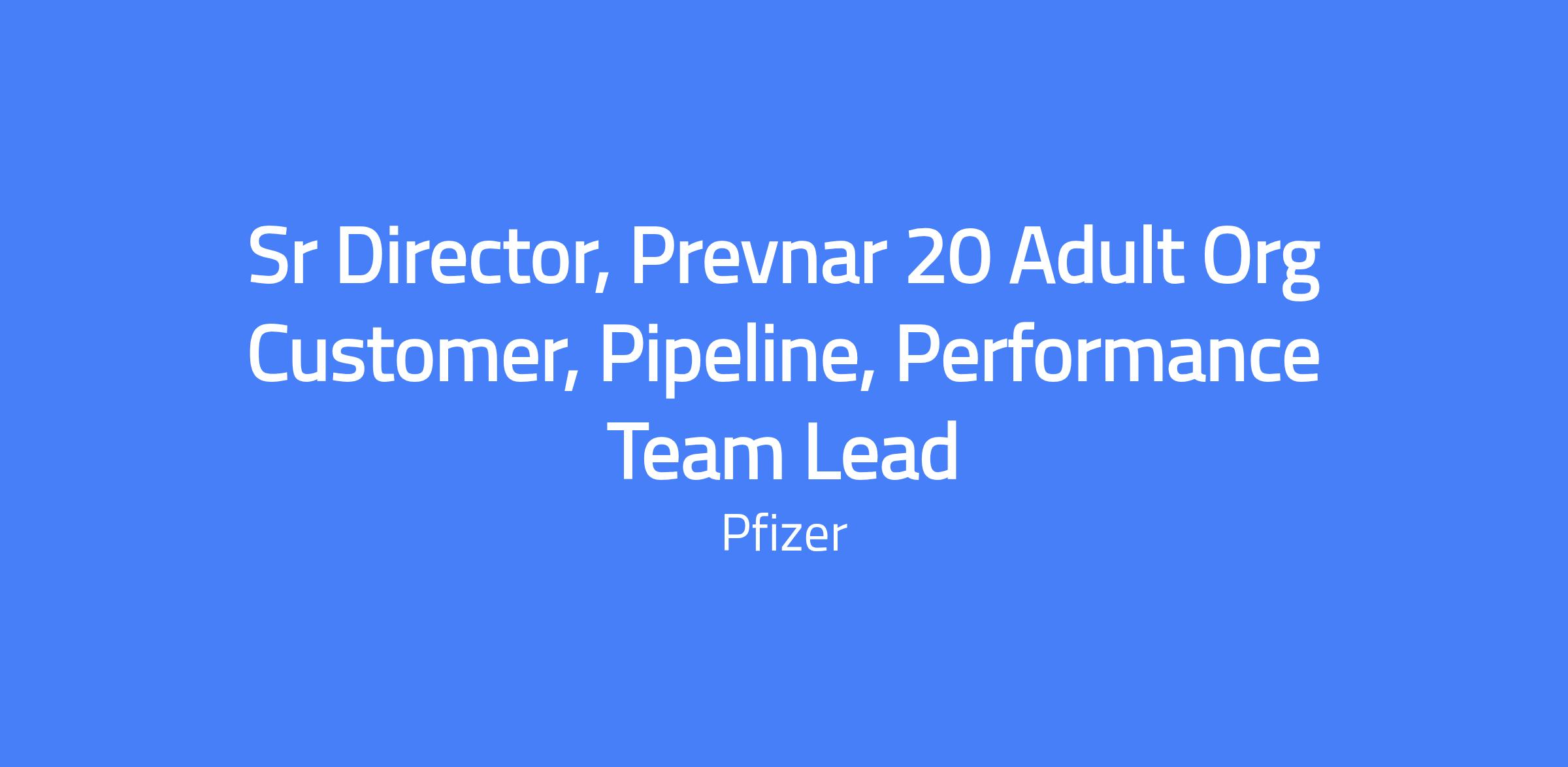 Sr Director, Prevnar 20 Adult Org Customer, Pipeline, Performance Team Lead. In this role you will lead a team of organized customer marketers focused on population-based decision makers across IDNs, Retailers and Payers, developing competitive marketing strategies and aligning cross-functional teams to drive best-in-class omni-channel execution. You will maximize budget/resources, measure performance, and contribute to pipeline strategy and in-line brand performance against objectives.