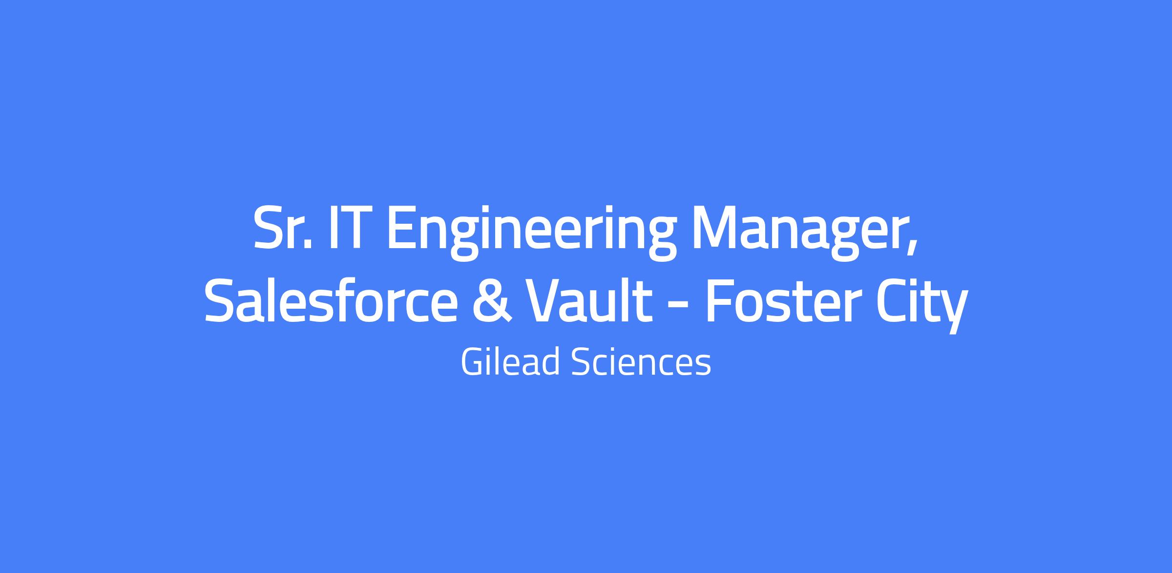 Sr. IT Engineering Manager, Salesforce & Vault – Foster City. Lead the global IT Engineering function supporting US Commercial Field Enablement, managing Salesforce and Vault platform capabilities for field-led events and engagements. Coordinate with MSP and enterprise IT teams to ensure secure, compliant, high-availability applications and data flows, and drive an enhancement roadmap in partnership with Product Owners. Own the cloud-based data replication layer (AWS S3) and downstream integrations to support governance and operational readiness.