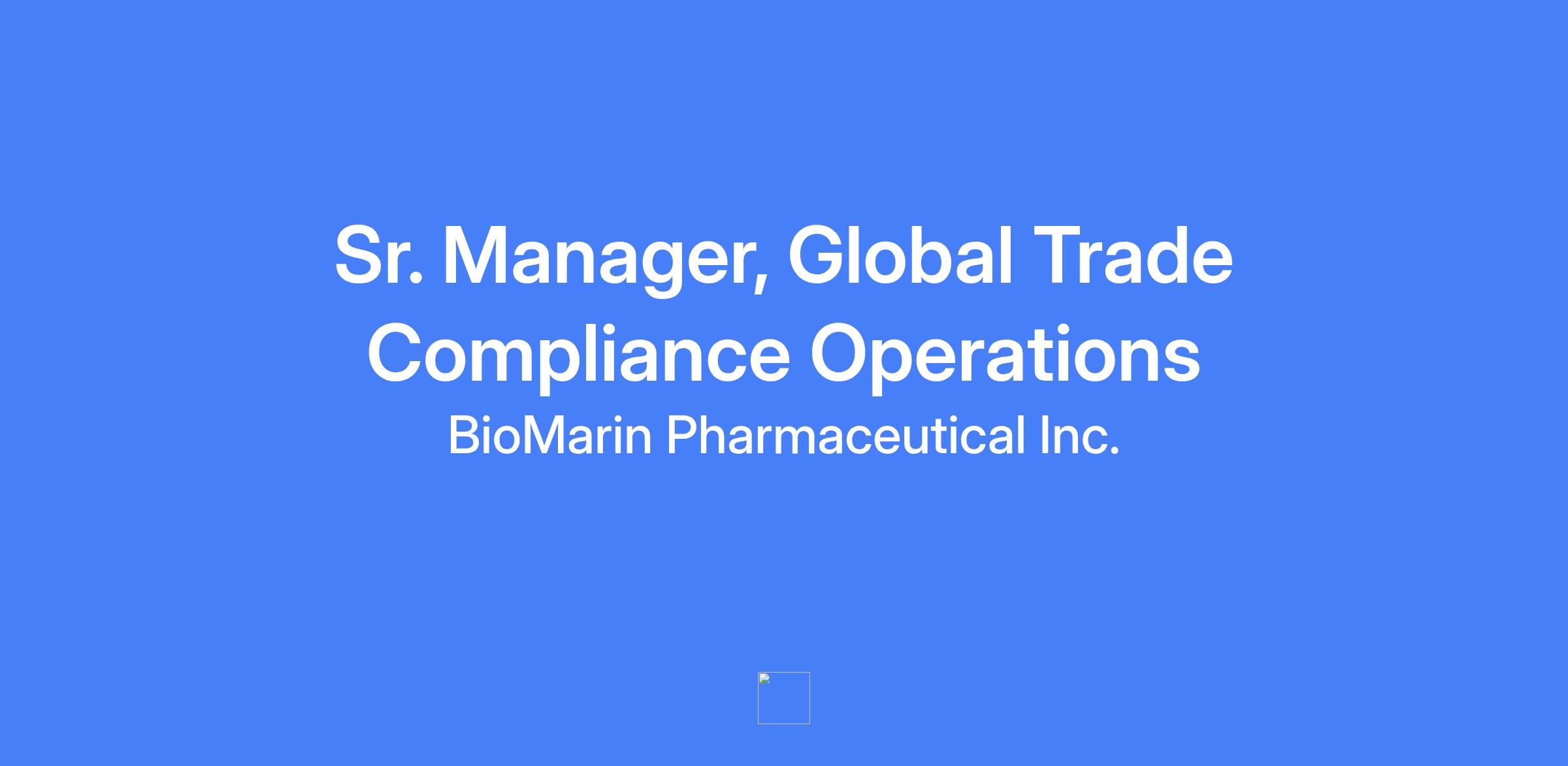 Sr. Manager, Global Trade Compliance Operations. Oversees global trade compliance activities within BioMarin's Global Supply Chain framework, supporting clinical, commercial, and development science areas to ensure smooth and compliant movement of finished goods, drug product, intermediates, raw materials, and research products across international borders.