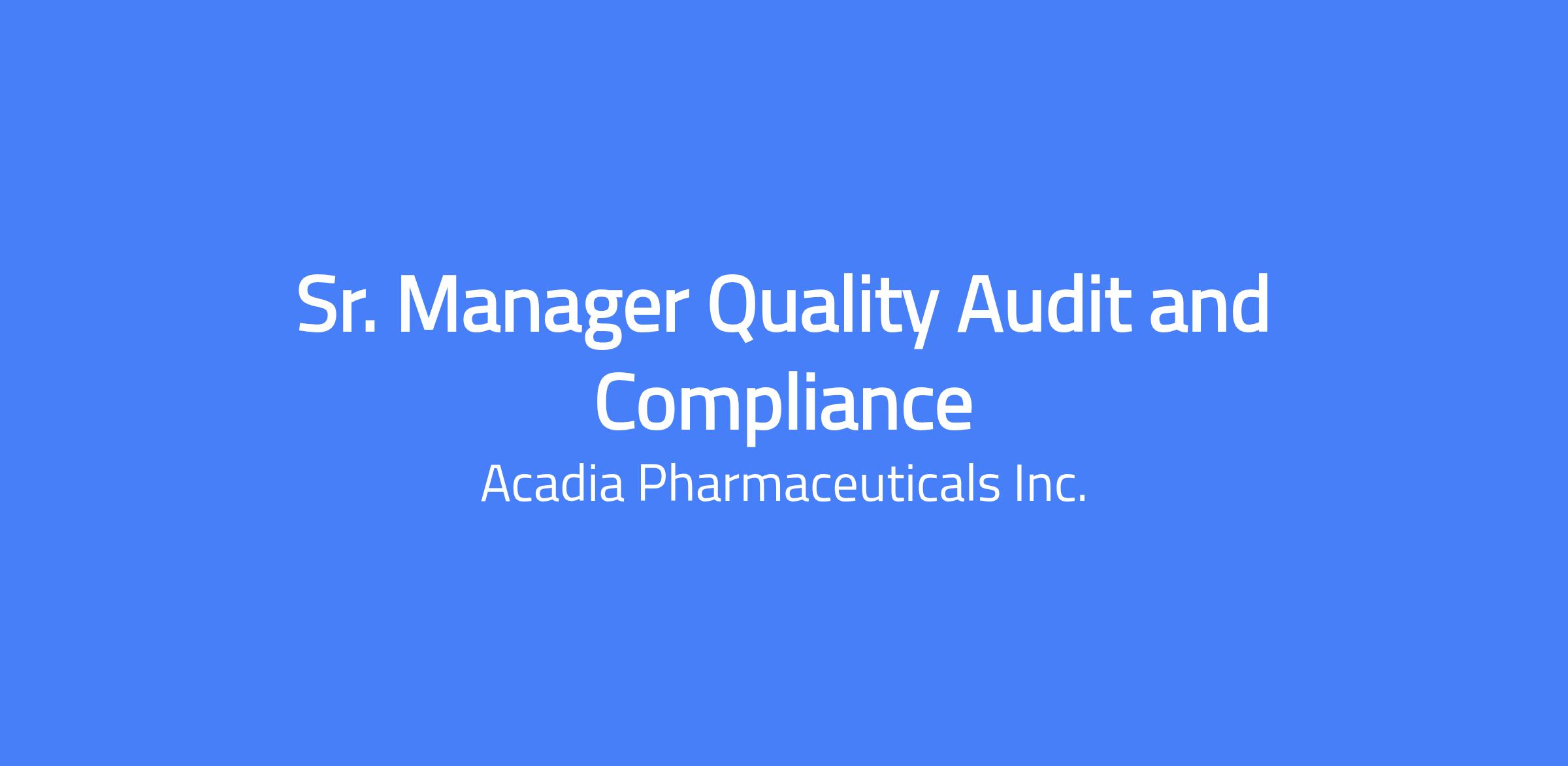 The Senior Manager, Quality Audits is responsible for leading and executing internal and external audits across Acadia’s expanding portfolio. This role plays a critical part in ensuring compliance with GMP and GxP regulations, maintaining robust Quality Agreements, and supporting the ongoing effectiveness and continuous improvement of Acadia’s Quality Management System. The position serves as a subject matter expert for audit readiness, regulatory compliance, and quality system optimization across clinical and commercial operations. This position can be based in San Diego, CA or Princeton, NJ or San Francisco, CA. Acadia's hybrid model requires this role to work in our office three days per week on average.