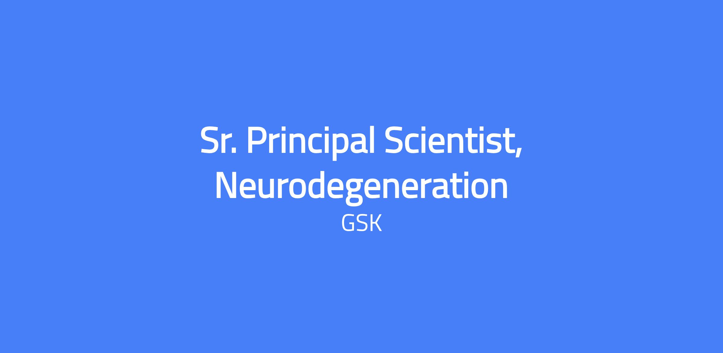 Senior Principal Scientist, Neurodegeneration leading neuroscience-focused biology efforts within the Respiratory Immunology Inflammatory Research Unit (RIIRU) at GSK's Upper Providence facility. The role supports research in neurodegenerative diseases (AD, PD, ALS) through target biology hypothesis development, assay creation, and cross-functional collaboration. Requires a PhD with substantial industry experience and a track record in early-stage drug discovery and neurodegeneration biology.
