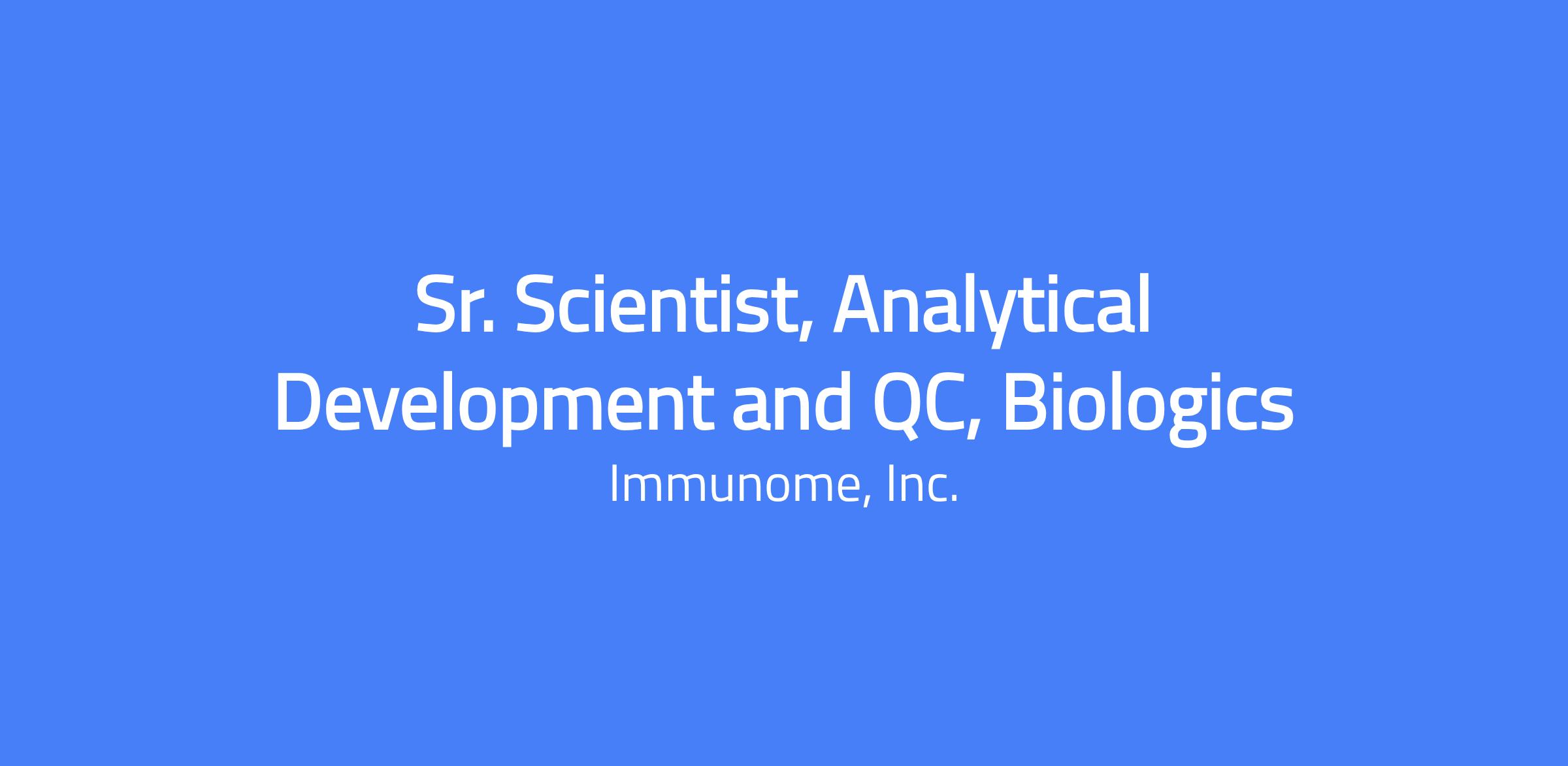 Immunome is seeking an experienced Senior Scientist, Analytical Development & QC to support its Antibody Drug Conjugate (ADC) portfolio. This role will be responsible for leading physicochemical analytical method development in collaboration with Contract Development and Testing Laboratories (CDMOs and CTLs), while also supporting the buildout of internal CMC analytical capabilities. The successful candidate will bring strong hands-on expertise in ADC analytical method development and product characterization, with particular depth in Liquid Chromatography (LC), Capillary Electrophoresis (CE, including icIEF), and Mass Spectrometry–based techniques. Experience managing external analytical testing activities, supporting technology transfer, and contributing to regulatory submissions is highly valued.