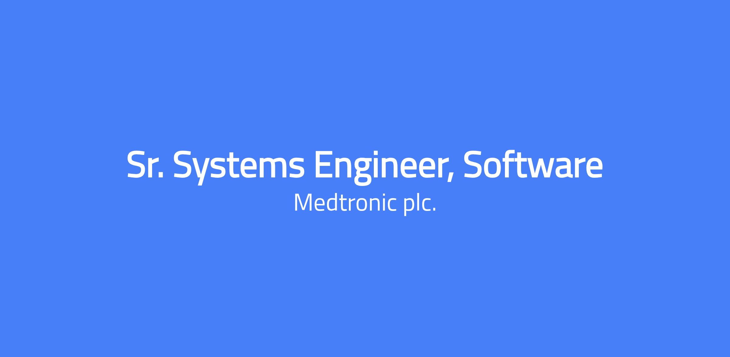 We anticipate the application window for this opening will close on - 27 Apr 2026 At Medtronic you can begin a life-long career of exploration and innovation, while helping champion healthcare access and equity for all. Youâll lead with purpose, breaking down barriers to innovation in a more connected, compassionate world. A Day in the Life At Medtronic, we bring bold ideas forward with speed and decisiveness to put patients first in everything we do. In-person exchanges are invaluable to our work. Weâre working a minimum of 4 days a week onsite as part of our commitment to fostering a culture of professional growth and cross-functional collaboration as we work together to engineer the extraordinary. Medtronic is seeking a motivated and detail-oriented Sr. Software Systems Engineer to join our Affera Mapping and Ablation System team, supporting the design and development of advanced software-enabled capital systems for the cardiac electrophysiology lab. The Sr. Systems Engineer will an integral member in the Affera Software Team, working on cutting-edge technology in the electrophysiology field. This role offers a rare chance to be at the forefront of helping develop a groundbreaking technology that can disrupt the industry. The ideal candidate has strong MBSE skills and experience using SysML (v1/v2) to support V-model traceability from requirements through verification. They will own key features, collaborate across engineering teams, and are enthusiastic about making a meaningful difference for millions. About the Affera Mapping and Ablation System The Affera Mapping and Ablation System is an innovative medical technology designed to treat patients with cardiac arrhythmias. The system involves advanced mapping techniques to create detailed images of the heart's electrical activity, helping physicians identify abnormal areas causing arrhythmias. Once identified, the Affera Ablation System delivers targeted energy to disrupt these abnormal signals, restoring normal heart rhythm. Primary Responsibilities Develop and maintain system and software architecture models using SysML (v1/v2). Apply MBSE principles to connect system intent to software services, APIs, schemas, modules, and firmware. Define interface contracts and allocations between system functions, software, and hardware components. Support V-model traceability across requirements, design, implementation, and verification Author and review software system requirements with full bidirectional traceability. Perform risk analysis activities including FMEA and interface risk identification. Contribute to process and tooling improvements for MBSE adoption and trace automation. Apply the appropriate standards, processes, procedures, and tools throughout the system development life cycle. Required Qualifications Bachelor's degree and a minimum of 4 years of relevant experience OR Masterâs degree with a minimum of 2 years of relevant experience OR PhD with 0 years relevant experience Preferred Qualifications Knowledge of Medical Product development, IEC-62304, ISO 13485, and FDA guidance in a technical discipline, preferably software related 4+ years of software verification experience Proficient in programming languages such as Python, C++/C# or similar languages Experience with requirements-driven development and traceability. Familiarity with MBSE concepts and SysML. Strong understanding of good documentation practices Experience with SysML v2 tooling. Experience writing technical reports Experience with QT/QML Experience with software version control systems, such as Git Experience with Agile development Strong work ethic and entrepreneurial drive Ability to work effectively in a fast-paced, collaborative environment. Strong communication skills, both written and verbal #LI-MDT For Baccalaureate degrees earned outside of the United States, a degree that satisfies the requirements of 8 C.F.R. § 214.2(h)(4)(iii)(A) is required. Physical Job Requirements The above statements are intended to describe the general nature and level of work being performed by employees assigned to this position, but they are not an exhaustive list of all the required responsibilities and skills of this position.⯠The physical demands described within the Responsibilities section of this job description are representative of those that must be met by an employee to successfully perform the essential functions of this job. Reasonable accommodations may be made to enable individuals with disabilities to perform the essential functions. For Office Roles: While performing the duties of this job, the employee is regularly required to be independently mobile. The employee is also required to interact with a computer, and communicate with peers and co-workers. Contact your manager or local HR to understand the Work Conditions and Physical requirements that may be specific to each role. U.S. Work Authorization & Sponsorship At Medtronic, we are committed to fostering an environment where employees can thrive and make a meaningful impact. In alignment with our enterprise-wide workforce planning approach, U.S. work authorization sponsorship (H-1B, TN, J, etc.) is offered exclusively for Principal-level roles and above, where specialized expertise aligns with long-term business needs. Roles below the Principal level require candidates to possess unrestricted U.S. work authorization at the time of hire and for the duration of employment. Join us in our mission to alleviate pain, restore health, and extend lifeâwhere your unique background and perspective are valued. Benefits & Compensation Medtronic offers a competitive Salary and flexible Benefits Package A commitment to our employees lives at the core of our values. We recognize their contributions. They share in the success they help to create. We offer a wide range of benefits, resources, and competitive compensation plans designed to support you at every career and life stage. Salary ranges for U.S (excl. PR)