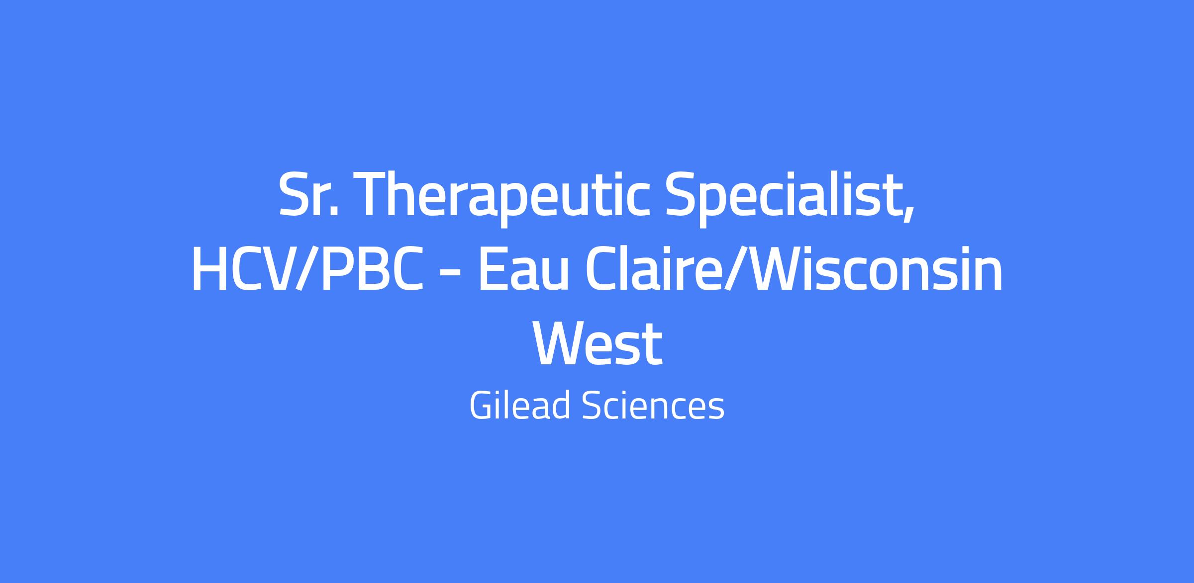 Senior Therapeutic Specialist – HCV/PBC responsible for representing Gilead's products to a defined customer base, generating and growing sales within a geographic area, and building strong relationships with healthcare practices to provide disease awareness information and clinical updates. Applies complex clinical concepts to diverse audiences and collaborates with internal teams to address geography-specific issues and opportunities. This role supports the Western Michigan/Eau Claire territory, including parts of Iowa and Michigan UP.