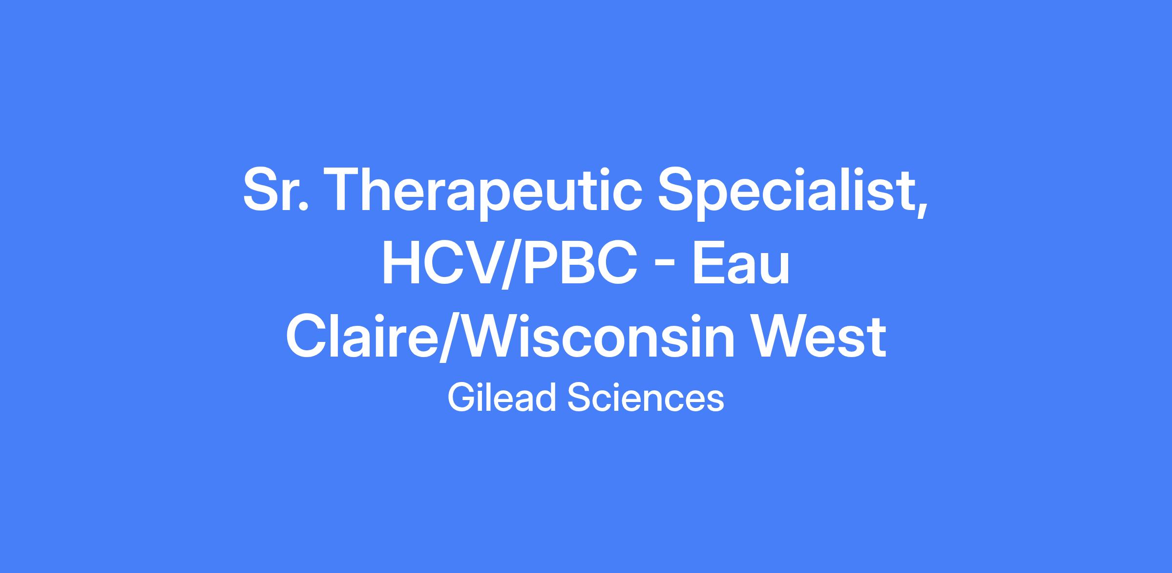Senior Therapeutic Specialist – HCV/PBC responsible for representing Gilead's products to a defined customer base, generating and growing sales within a geographic area, and building strong relationships with healthcare practices to provide disease awareness information and clinical updates. Applies complex clinical concepts to diverse audiences and collaborates with internal teams to address geography-specific issues and opportunities. This role supports the Western Michigan/Eau Claire territory, including parts of Iowa and Michigan UP.