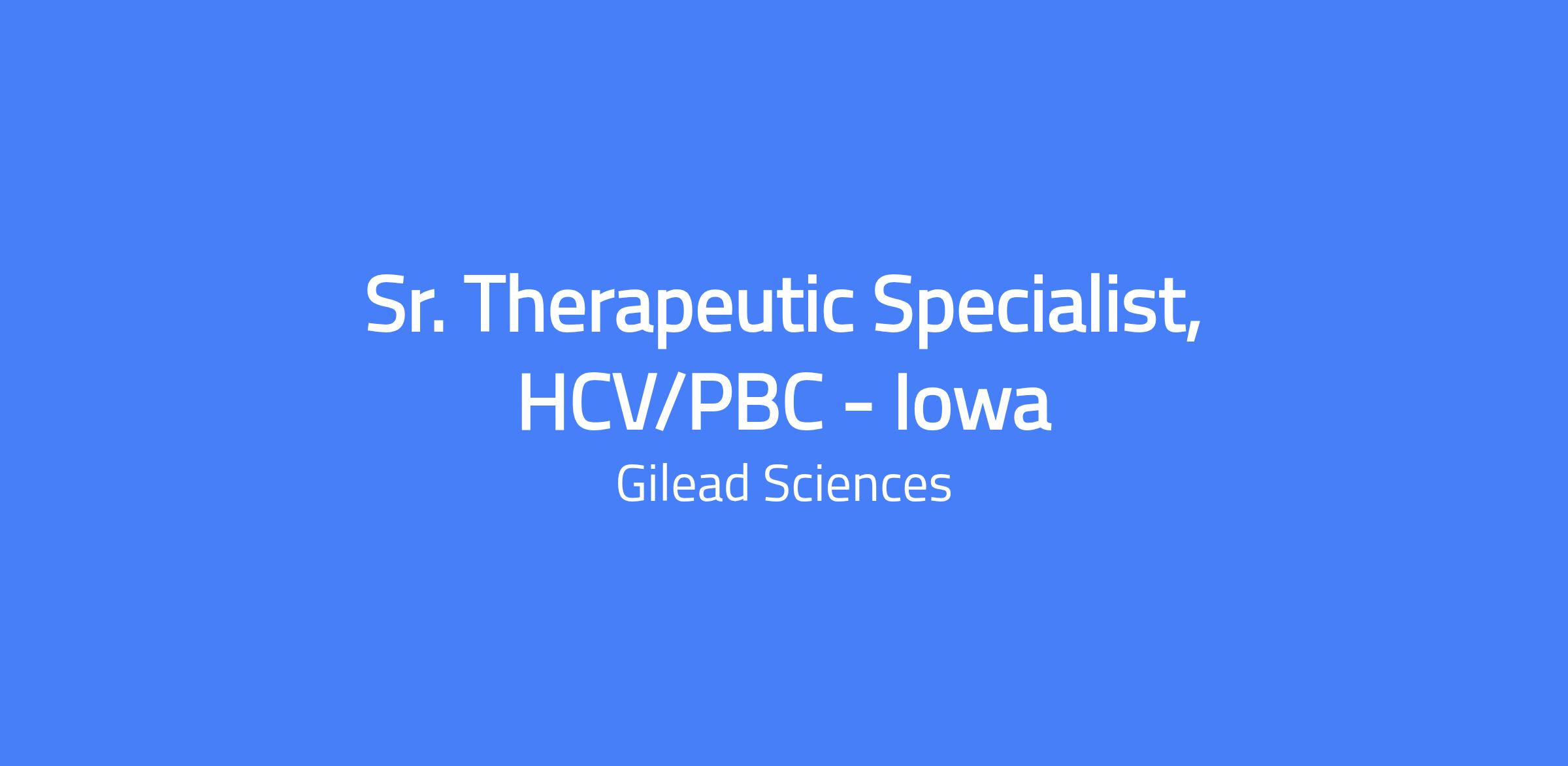 Senior Therapeutic Specialist – HCV/PBC for the Iowa territory. Responsible for representing Gilead's products to a defined customer base, generating and growing sales, and achieving targets within a specific geographic area through in-person interactions with healthcare professionals. Develops strong working relationships with practices to provide disease awareness information, clinical updates, and healthcare changes, translating complex clinical concepts for diverse audiences. Demonstrates knowledge of the disease state and geography-specific opportunities, with a focus on compliant, effective product promotion and education.