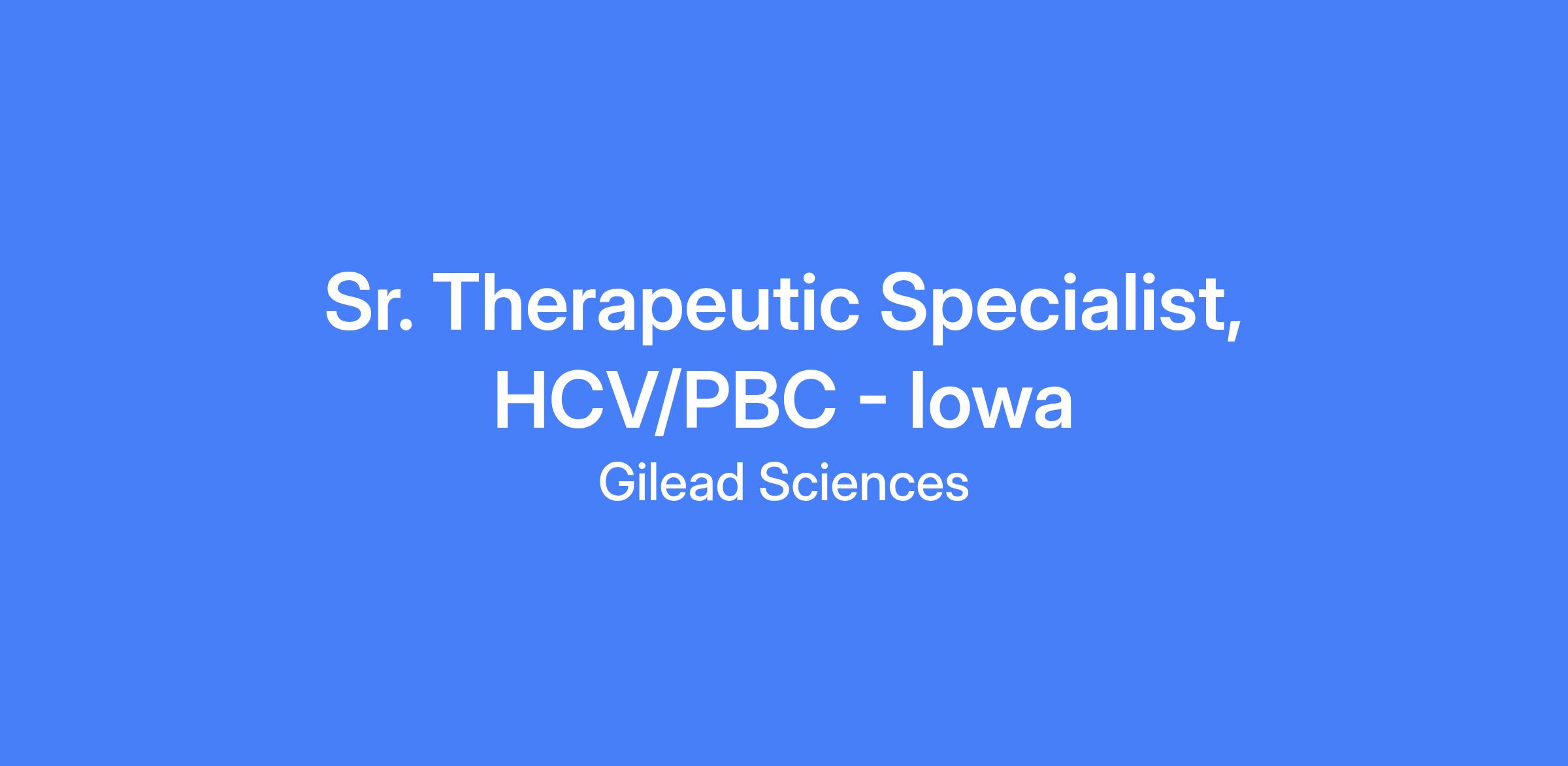 Senior Therapeutic Specialist – HCV/PBC for the Iowa territory. Responsible for representing Gilead's products to a defined customer base, generating and growing sales, and achieving targets within a specific geographic area through in-person interactions with healthcare professionals. Develops strong working relationships with practices to provide disease awareness information, clinical updates, and healthcare changes, translating complex clinical concepts for diverse audiences. Demonstrates knowledge of the disease state and geography-specific opportunities, with a focus on compliant, effective product promotion and education.