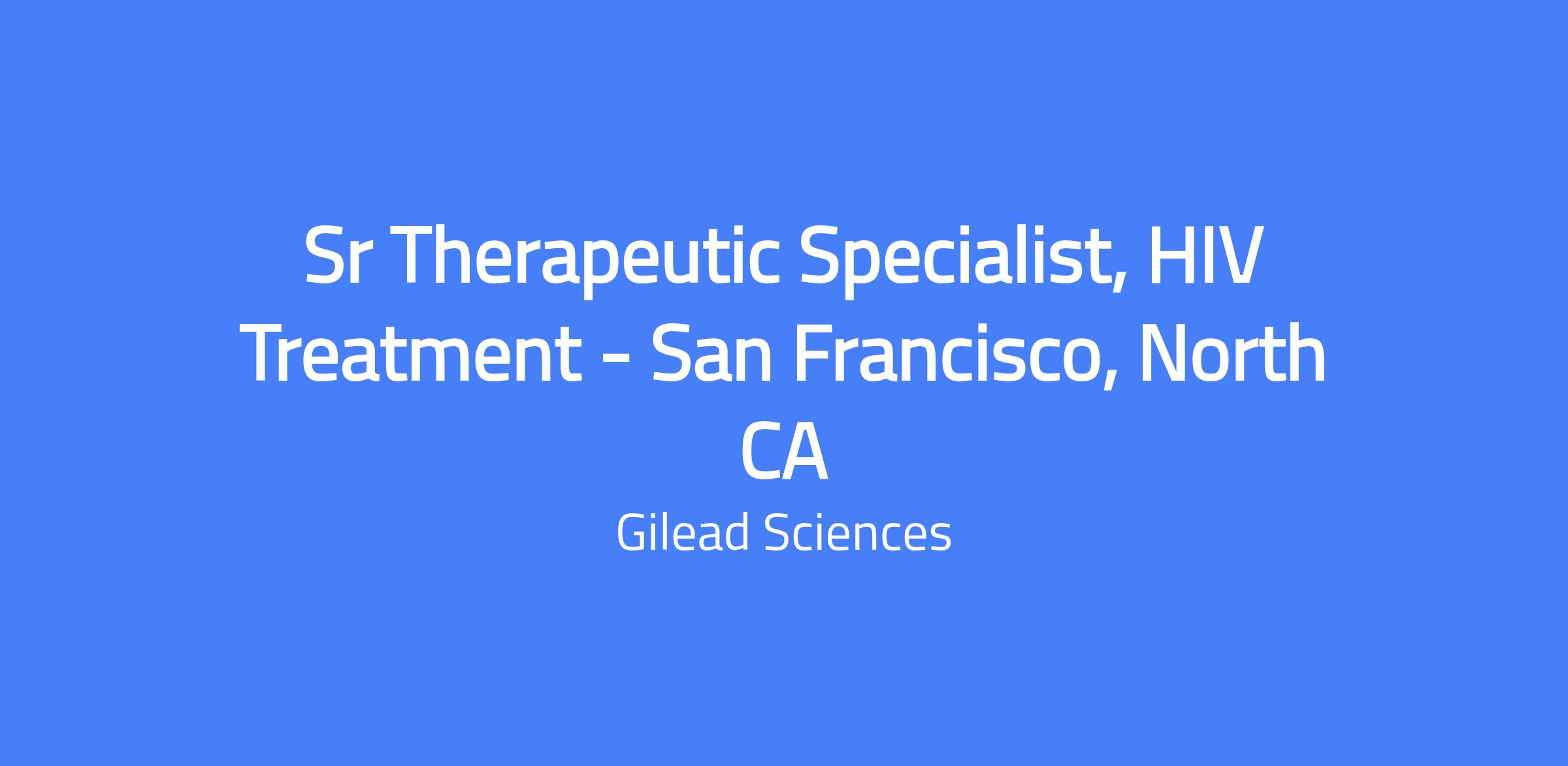 Senior Therapeutic Specialist, HIV Treatment in San Francisco, North CA. Represent products to a defined customer base and drive sales growth within a geographic area via account management, in-person engagement, and strategic partnerships. Establish strong relationships with healthcare providers, deliver timely disease awareness information and clinical updates, and translate complex clinical concepts for diverse audiences. Travel within the assigned area may be required.