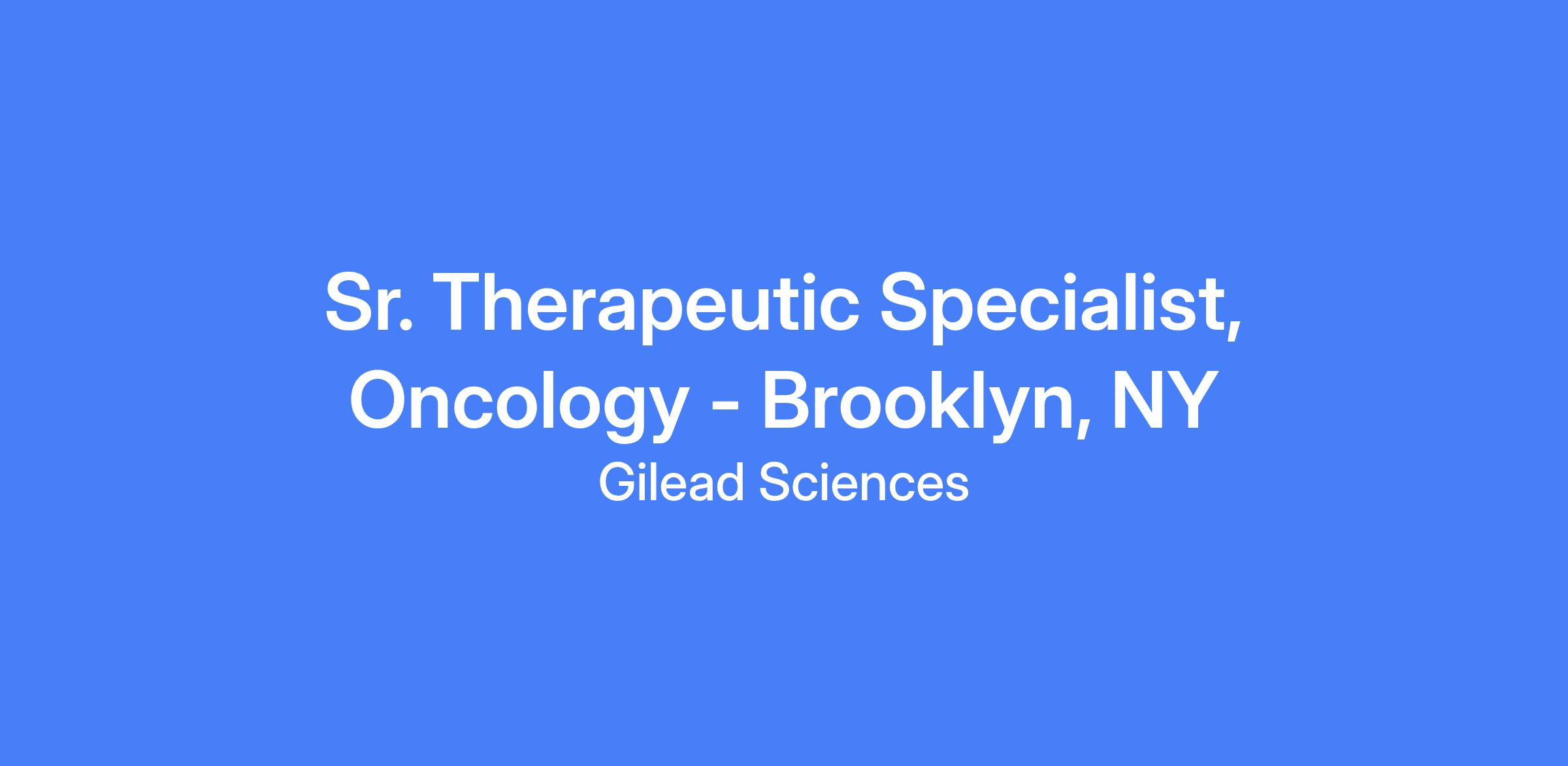Senior Therapeutic Specialist, Oncology, represents Gilead's products and services to a defined customer base within a specific geographic area, with a focus on achieving or exceeding sales targets. The role involves in-person representation and meetings with healthcare practitioners, building strong relationships with practices to provide disease awareness information, clinical updates, and healthcare changes. This opportunity covers the Brooklyn, NY territory.