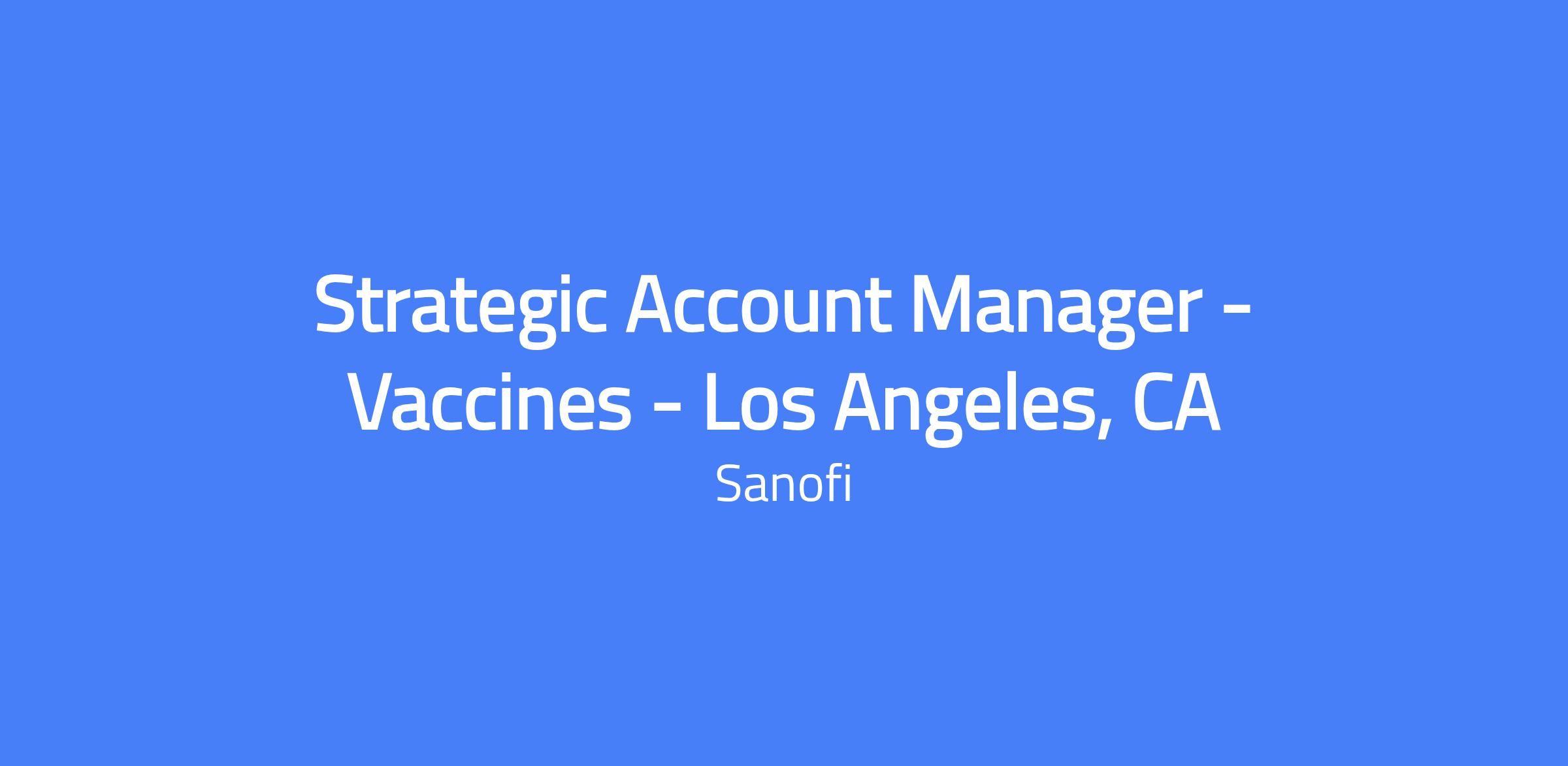 Strategic Account Manager-Pacific West based in Los Angeles, CA (remote/field) leading and coordinating engagement with Sanofi’s largest and most complex vaccine accounts. Responsible for building strategic account plans, aligning cross-functional teams, and driving value co-creation to meet or exceed revenue targets.