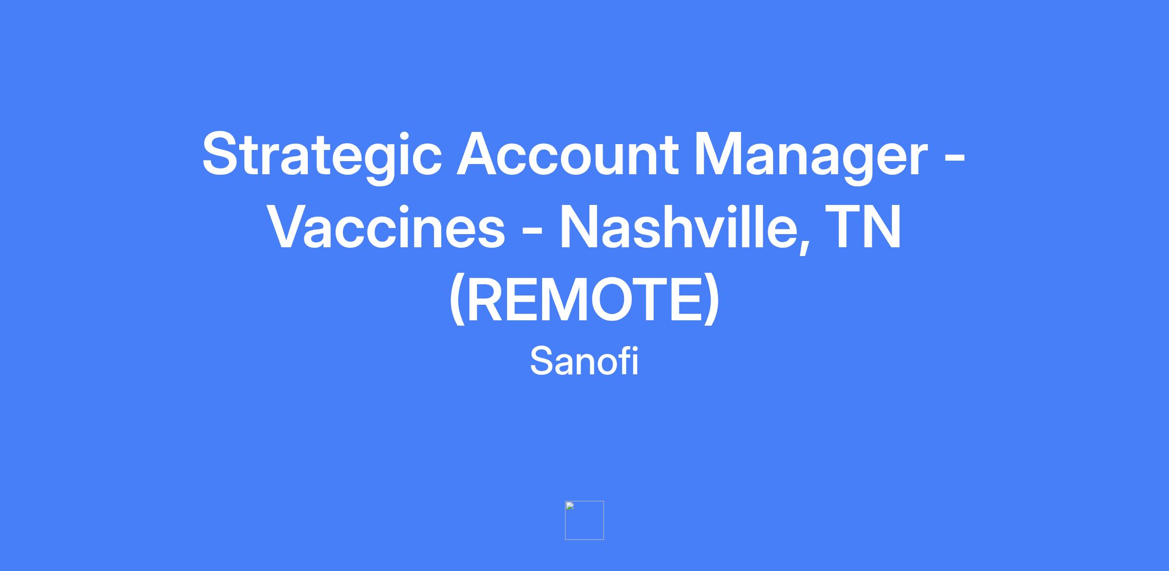 Strategic Account Manager - Vaccines, Nashville, TN (REMOTE). Lead strategic accounts, manage cross-functional teams, and drive value with Sanofi’s largest and most complex vaccine customers. Develop and execute strategic account plans to achieve revenue targets and co-create value with customers.