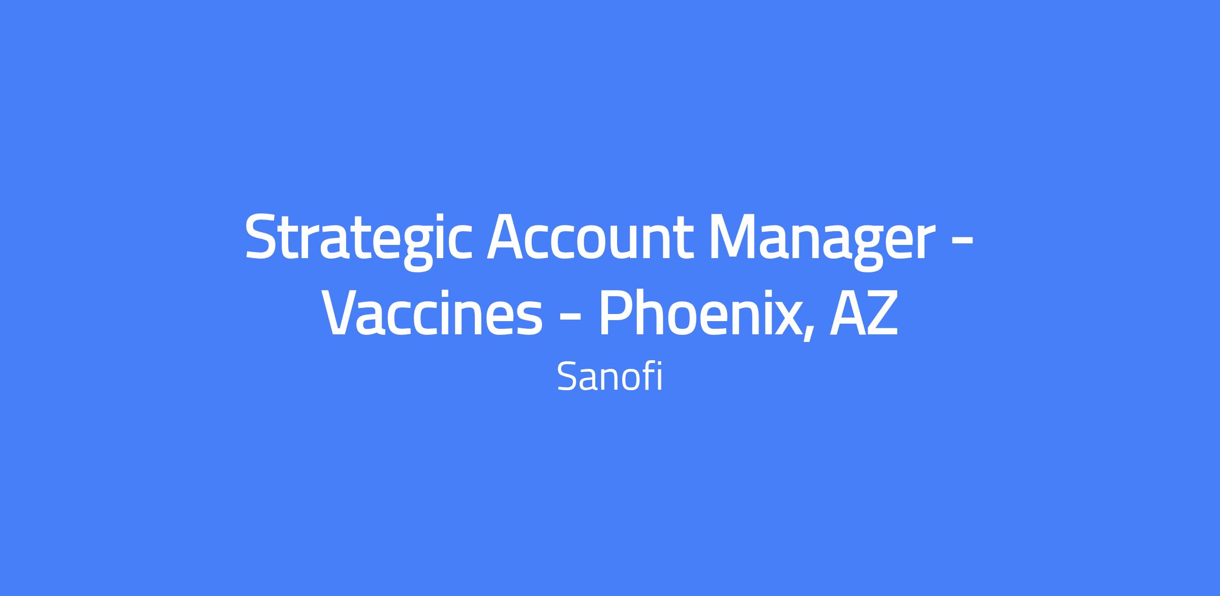 The Strategic Account Manager for Vaccines leads the Strategic Account Management organization, serving our largest and most complex customers and managing our highest valued vaccine contracts. You will own assigned strategic accounts as a business partnership on behalf of Sanofi, build strategic account plans, and coordinate cross-functional resources to drive value co-creation and meet revenue targets. Customers include Health Systems, IHNs, Medical Groups, PBGs, FQHCs and state awardees. This remote/field role is based in Phoenix, AZ.