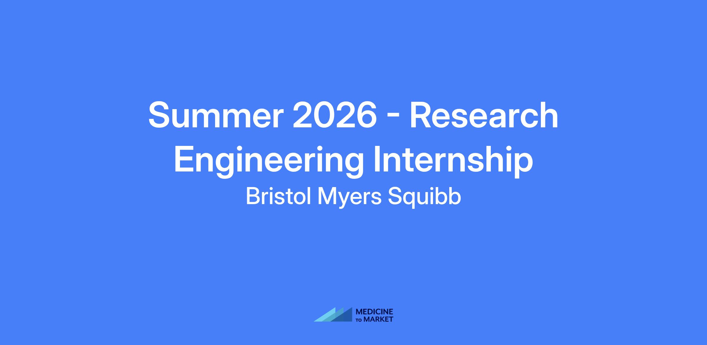Summer 2026 - Research Engineering Internship at Bristol Myers Squibb. The intern will work in the Research Engineering (RE) group within the Informatics and Predictive Sciences (IPS) group, applying generative AI, LLMs, and agentic frameworks to translational research use cases and drug development. The internship provides exposure to the drug development process, collaboration across disciplines, and opportunities to network within BMS. The full-time internship runs JuneโรรฌAugust 2026.