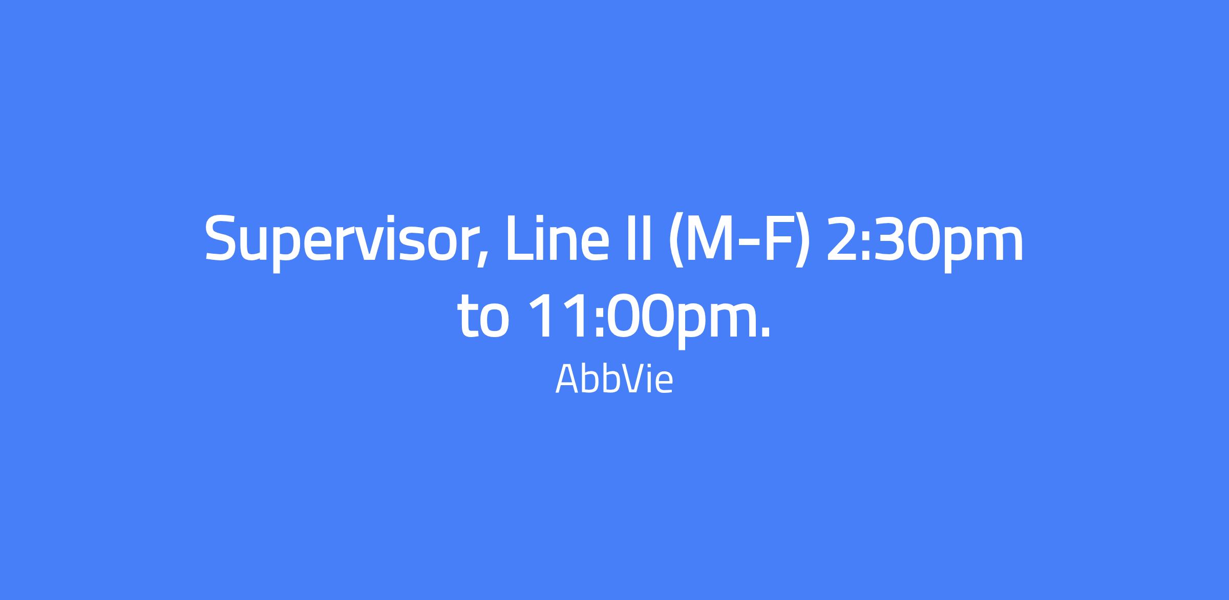 Supervisor, Line II β MondayβFriday, 2:30pm to 11:00pm. Lead and participate in a fast-paced pharmaceutical finishing operation to meet production requirements with a strong emphasis on safety and quality. Responsible for supporting setup, changeover, packaging, and equipment troubleshooting on multiple lines, and for creating a safety- and quality-focused environment by optimizing line resources to drive performance to meet or exceed production targets.