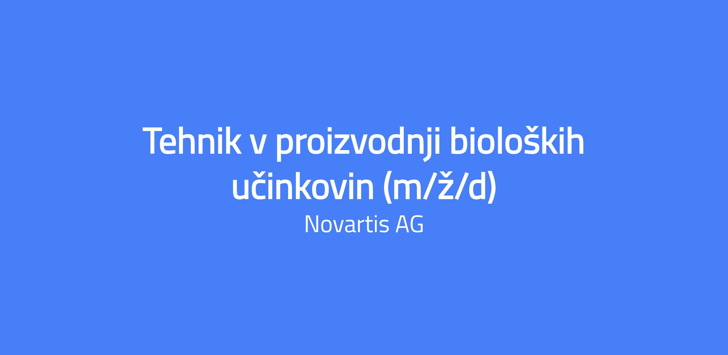 Job Description Summary #LI-Onsite Lokacija: MengeÅ¡ Interni naziv pozicije: Tehnik II Postanite Tehnik v proizvodnji bioloÅ¡kih uÄinkovin v MengÅ¡u. Imeli boste odgovornost za pripravo, neposredno izvajanje in nadzor proizvodnega procesa z namenom realizacije proizvodnje, skladno z zakonodajo, internimi predpisi, dobrimi praksami in poslovnimi cilji. Job Description VaÅ¡e kljuÄne odgovornosti: Upravljanje in sodelovanje pri proizvodnih procesih. Uporabljanje in uveljavljanje aktualnih pravil dobre proizvodne prakse (GMP) ter dosledno dokumentiranje aktivnosti v skladu s predpisi dobre proizvodne prakse (GMP). Zagotavljanje/spremljanje pravilnega delovanja opreme s ciljem odkrivanja zgodnjih znakov nepravilnosti. V primeru okvare ustrezno ukrepanje. Odgovornost za pravoÄasno in toÄno pregledovanje in dokumentiranje evidenc o serijah. Po potrebi vzorÄenje, razdeljevanje, distribuiranje in izvajanje medprocesnih kontrol. Odgovorno izvajanje posameznih faz v postopku (priprava, izvedba, zakljuÄek). Druge naloge po navodilu nadrejenega in naloge na podlagi posebnega imenovanja. VaÅ¡ doprinos k delovnem mestu: SrednjeÅ¡olska stopnja izobrazbe - zaželeno naravoslovne/tehniÄne smeri. OdliÄno znanje slovenskega jezika in osnovno znanje angleÅ¡kega jezika. Osnovno znanje uporabe raÄunalnika in poznavanje orodja Microsoft Office. Vsaj 1 leto ustreznih delovnih izkuÅ¡enj. Odzivnost in dobre delovne navade. Z izbranim kandidatom bomo sklenili delovno razmerje za doloÄen Äas s poskusno dobo 6 mesecev. Sodelavci so vkljuÄeni v 4 izmenski delovnik, ki jim omogoÄa, da so en teden v mesecu prosti. Delo poteka en teden v noÄni izmeni, en teden popoldne, en teden dopoldne in en teden prosto: 1. teden: nedelja 18:00 do 6:00, pon-pet od 22:00 do 6:00, sobota 18:00 do 6:00, 2. teden: pon-pet od 14:00 do 22:00, nedelja 6:00 do 18:00, 3. teden: pon-pet 6:00 do 14:00, sobota 6:00 do 18:00, 4. teden: Prosti teden in nato se ponovi cikel z noÄno izmeno z zaÄetkom v nedeljo ob 18:00 Kaj nudimo: KonkurenÄen plaÄni paket, letni bonus, pokojninsko shemo, shemo nagrajevanja in priznanja dosežkov, razÅ¡irjeni program promocije zdravja na podroÄju telesnega, duÅ¡evnega in družbenega poÄutja (Polni življenja) ter dogodke, neomejene priložnosti za uÄenje in razvoj. Preberite naÅ¡ priroÄnik, da spoznate naÄine, s katerimi bomo spodbujali vaÅ¡ osebni in profesionalni razvoj: https://www.novartis.com/careers/benefits-rewards. Predani smo raznolikosti in vkljuÄenosti: Novartis si prizadeva ustvariti izjemno, vkljuÄujoÄe delovno okolje in oblikovanje raznolikih timov, saj ti predstavljajo naÅ¡e bolnike in skupnosti, ki jih oskrbujemo. Zakaj Novartis: Pomagati bolnikom in njihovim družinam zahteva veÄ kot le inovativno znanost. Potrebna je skupnost zavzetih ljudi, kot ste vi. V Novartisu cenimo sodelovanje, podporo in navdihovanje drug drugega za razvoj prebojnih terapij, ki spreminjajo življenja pacientov. Ste pripravljeni ustvariti svetlejÅ¡o prihodnost skupaj z nami? https://www.novartis.com/about/strategy/people-and-culture. Pridružite se Novartisu: Ni pravo delovno mesto za vas? Prijavite se v naÅ¡o bazo talentov, da ostanete v kontaktu z nami in se seznanite z ustreznimi kariernimi priložnostmi takoj, ko se pojavijo: https://talentnetwork.novartis.com/network. Skills Desired General Hse Knowledge , gmp knowledge Improving the lives of people living with disease takes more than innovative science. It takes a focus on the needs of people and a community committed to meeting them. It takes a team of people like you. Working together. Learning together. Thriving together. Discover how you can join us in changing peopleâs lives. Novartis is aware of employment scams which make false use of our company name or leaderâs names or recruiterâs names to defraud job seekers. Novartis does not make job offers without interview and never asks candidates for money. If you have encountered a job posting or been approached with a job offer that you suspect may be fraudulent, we strongly recommend you do not respond, send money or personal information. In the context of China Cross-Border Data Transfer (CBDT) policy, if you need to apply for a position in China, please go to the local Recruiting System TaleNov .