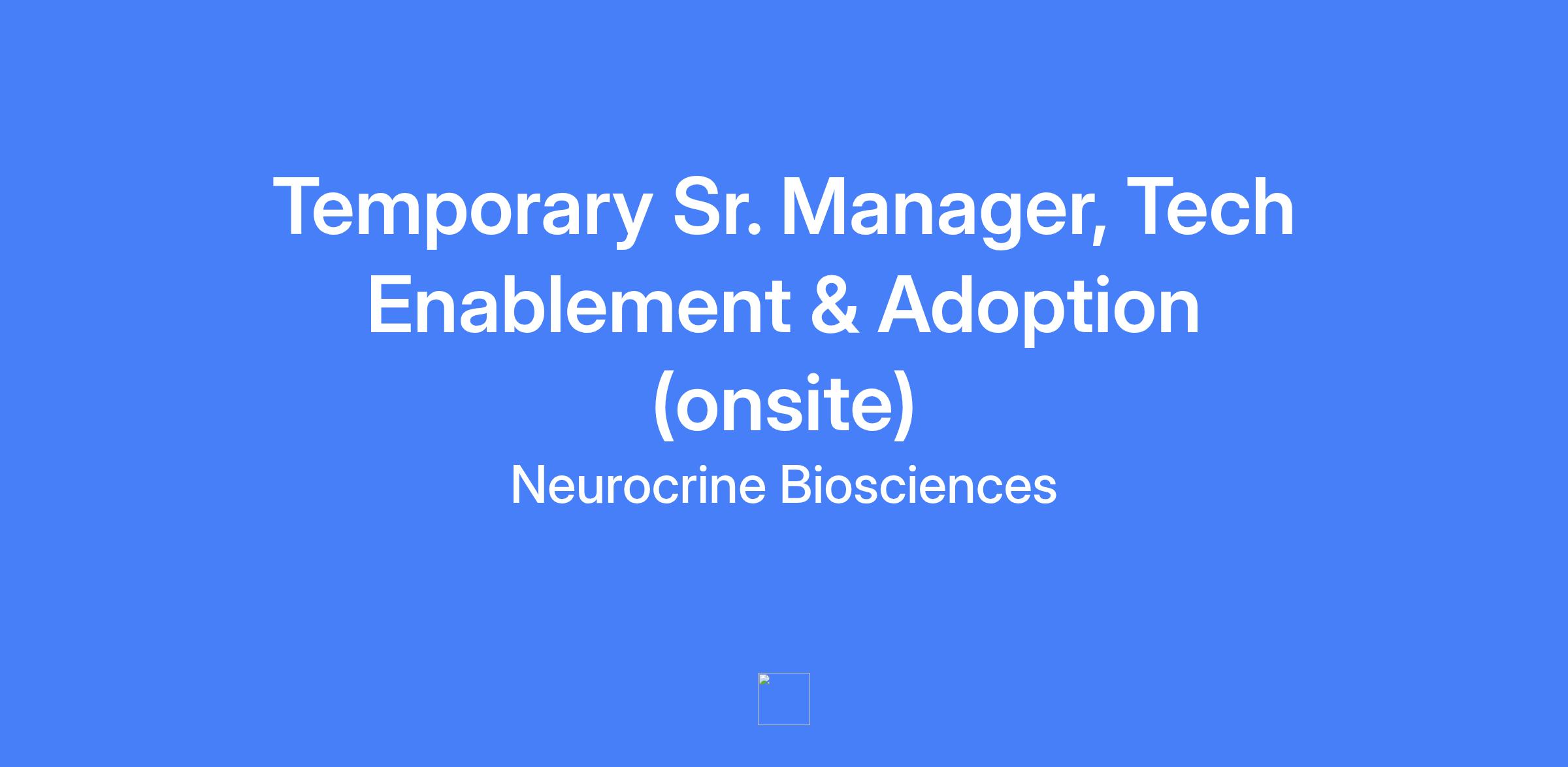 Temporary Sr. Manager, Tech Enablement & Adoption (onsite) at Neurocrine Biosciences. Responsible for designing, launching, and leading the Technology Enablement & Adoption (TEA) program from the ground up. Builds and manages a team that drives technology engagement, learning, and adoption across the enterprise.
