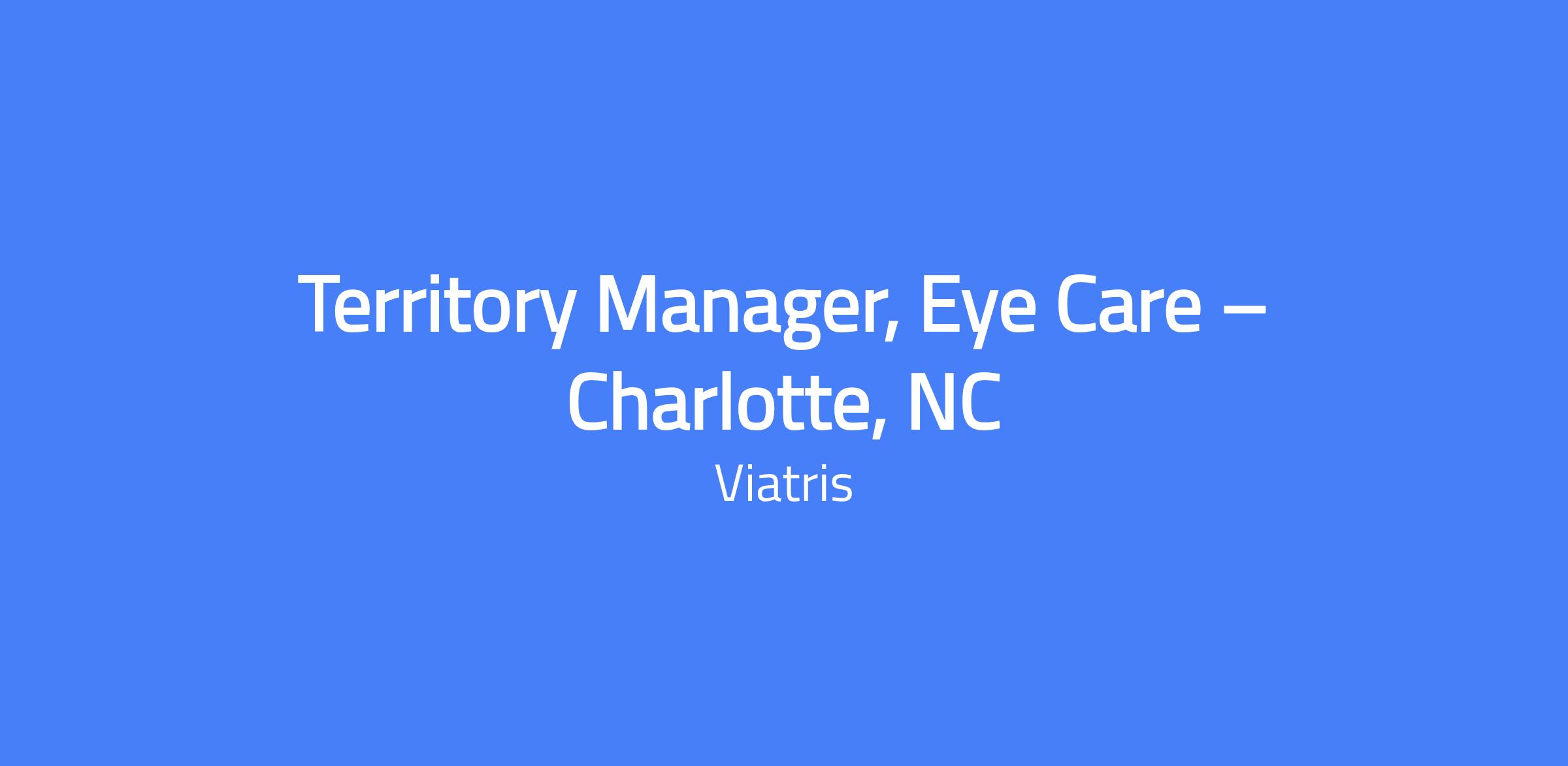 Territory Manager, Eye Care – Charlotte, NC. Responsible for meeting and exceeding sales objectives within the Charlotte, NC territory and adjacent areas. Develops and maintains strong partnerships with targeted Eye Care accounts, represents Viatris’ vision and culture, and leverages disease-state knowledge and market trends to drive pull-through while adhering to compliance and regulatory standards.