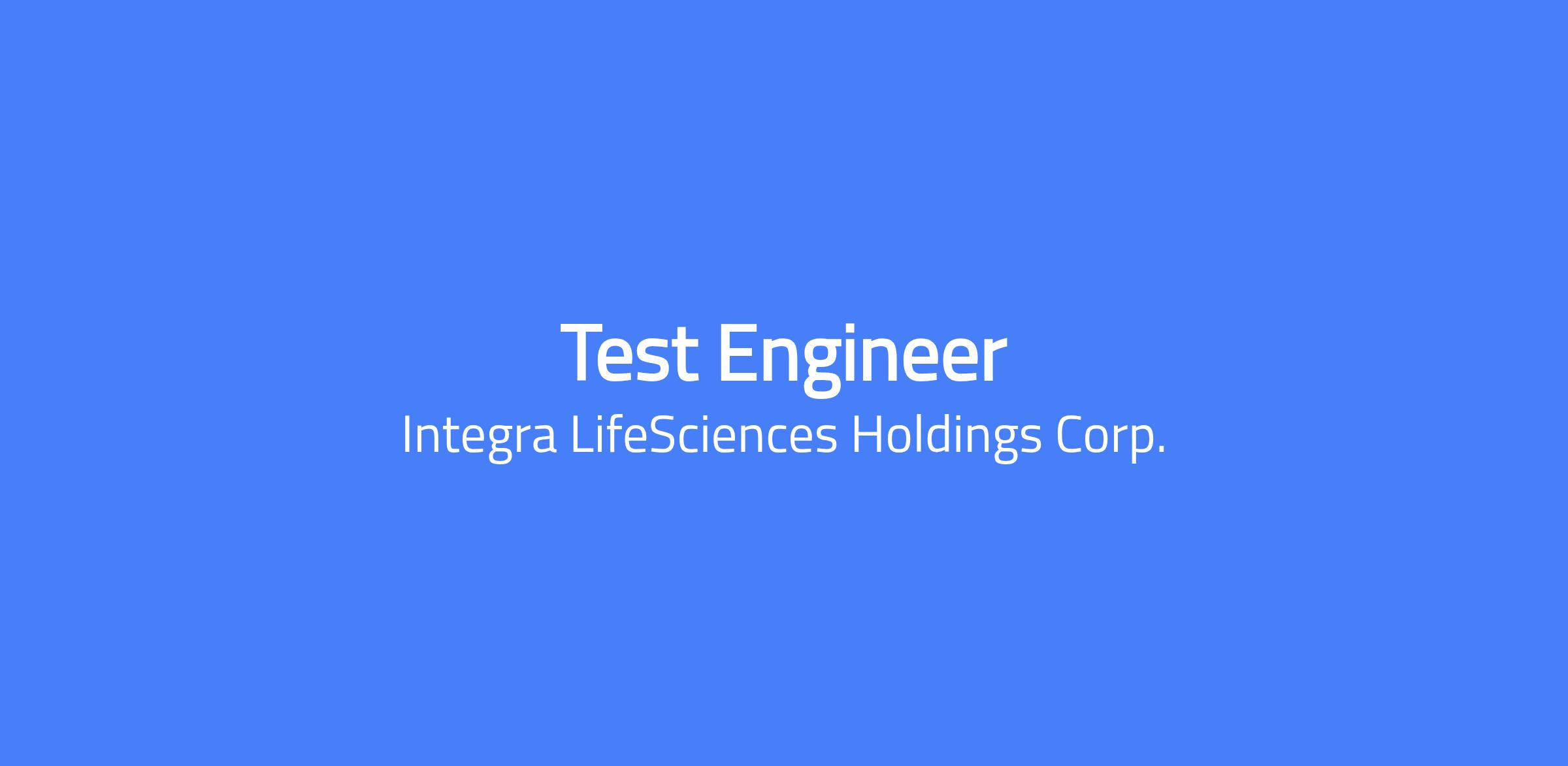 Changing lives. Building Careers. Joining us is a chance to do important work that creates change and shapes the future of healthcare. Thinking differently is what we do best. To us, change equals opportunity. Every day, our colleagues are challenging whatâs possible and making headway to innovate new treatment pathways to advance patient outcomes and set new standards of care. The Test Engineer is responsible for all aspects of product development and R&D testing. This includes protocol generation, test development and fixture design, test execution and reporting. The testing will be in support of NPI projects as well as sustaining engineering activities. To perform this job successfully, an individual must be able to perform each essential duty satisfactorily. Performs complex tests of equipment, prototypes, processes, and products requiring understanding instrumentation and electrical test systems. Performs test protocols, computations, standard spreadsheet analysis, and presentation of data. Creates test protocols and procedures that can be qualified and utilized by other test resources. Work with subject matter experts (SME) to develop DOEs as needed. Evaluates designs and makes suggestions for improvements related to test needs and results. Maintains laboratory notebooks according to Integra practices. Demonstrates skill in the use and care of all tools and equipment. Maintains a clean, safe, and orderly work area. Follow all safety procedures. Testing will require work with animal tissue samples such as beef steak, calves liver, and pork bone or pig cranium. Simulation of surgical practices with manual cutting of tissue is performed with ultrasonic aspirator and monopolar coagulation systems. Cleaning lab equipment and prototypes using disinfectants and autoclave systems is routine. Qualification The requirements listed below are representative of the knowledge, skill and/or ability required for this position. Education: Required: BS in Electrical, Mechanical, Biomedical Engineering, or equivalent technical degree with knowledge of oscilloscopes, power measurement, and other electromechanical instrumentation with demonstrated hands-on experience. Experience: A combination of education with lab work or work experience of a minimum of 3 years. Formal training with introductory courses or lab work in electronics or circuits is preferred. Demonstrated experience with MS Excel is essential. A working knowledge or experience with statistical analysis software, such as Minitab, is preferred. A working knowledge or experience with computer-based instrumentation, such as LabVIEW or MATLAB, is preferred. Knowledge of neurosurgical products and relevant test methods preferred. Salary Pay Range: $62,100.00 - $85,100.00 USD Salary Our salary ranges are determined by role, level, and location. Individual pay is determined by several factors including job-related skills, experience, and relevant education or training. In addition to base pay, employees may be eligible for bonus, commission, equity or other variable compensation. Your recruiter can share more about the specific salary range for your preferred location during the hiring process. Additional Description for Pay Transparency: Subject to the terms of their respective plans, employees and/or eligible dependents are eligible to participate in the following Company sponsored employee benefit programs: medical, dental, vision, life insurance, short- and long-term disability, business accident insurance, and group legal insurance, and savings plan (401(k)). Subject to the terms of their respective policies and date of hire, Employees are eligible for the following https://jobs.integralife.com/total-rewards/ Integra LifeSciences is an equal opportunity employer, and is committed to providing equal employment opportunities to all qualified applicants and employees regardless of race, marital status, color, religion, sex, age, national origin, sexual orientation, physical or mental disability, or protected veteran status. This site is governed solely by applicable U.S. laws and governmental regulations. If you'd like more information on your rights under the law, please see the following notices: EEO Is the Law | EOE including Disability/Protected Veterans Integra LifeSciences is committed to provide qualified applicants and employees who are disabled veterans or individuals with disabilities with needed reasonable accommodations in accordance with the ADA. If you have difficulty using our online system due to a disability and need an accommodation, please email us at careers@integralife.com. Unsolicited Agency Submission Integra LifeSciences does not accept unsolicited assistance from search firms for employment opportunities. All CVs/resumes submitted by search firms to any employee at our company without a valid written search agreement in place for this position will be deemed the sole property of our company. No fee will be paid in the event a candidate is hired by our company as a result of an agency referral where no pre-existing agreement is in place. A formal written agreement is required before engaging any agency, and it must be executed and authorized by the Vice President, Talent Acquisition. Where agency agreements are in place, introductions (the initial sharing of a candidateâs name, resume, or background) are position-specific and may only occur within the scope of that approved agreement. Please, no phone calls or emails. Integra - Employer Branding from Integra LifeSciences on Vimeo Changing Lives. Building Careers. Integra LifeSciences, a world leader in medical technology, is dedicated to limiting uncertainty for surgeons, so they can concentrate on providing the best patient care. Integra offers innovative solutions in neurosurgery, reconstructive and general surgery, and regenerative wound care. Founded in 1989 Integra is headquartered in Princeton, New Jersey and has more than 4,000 employees worldwide. Integraâs co