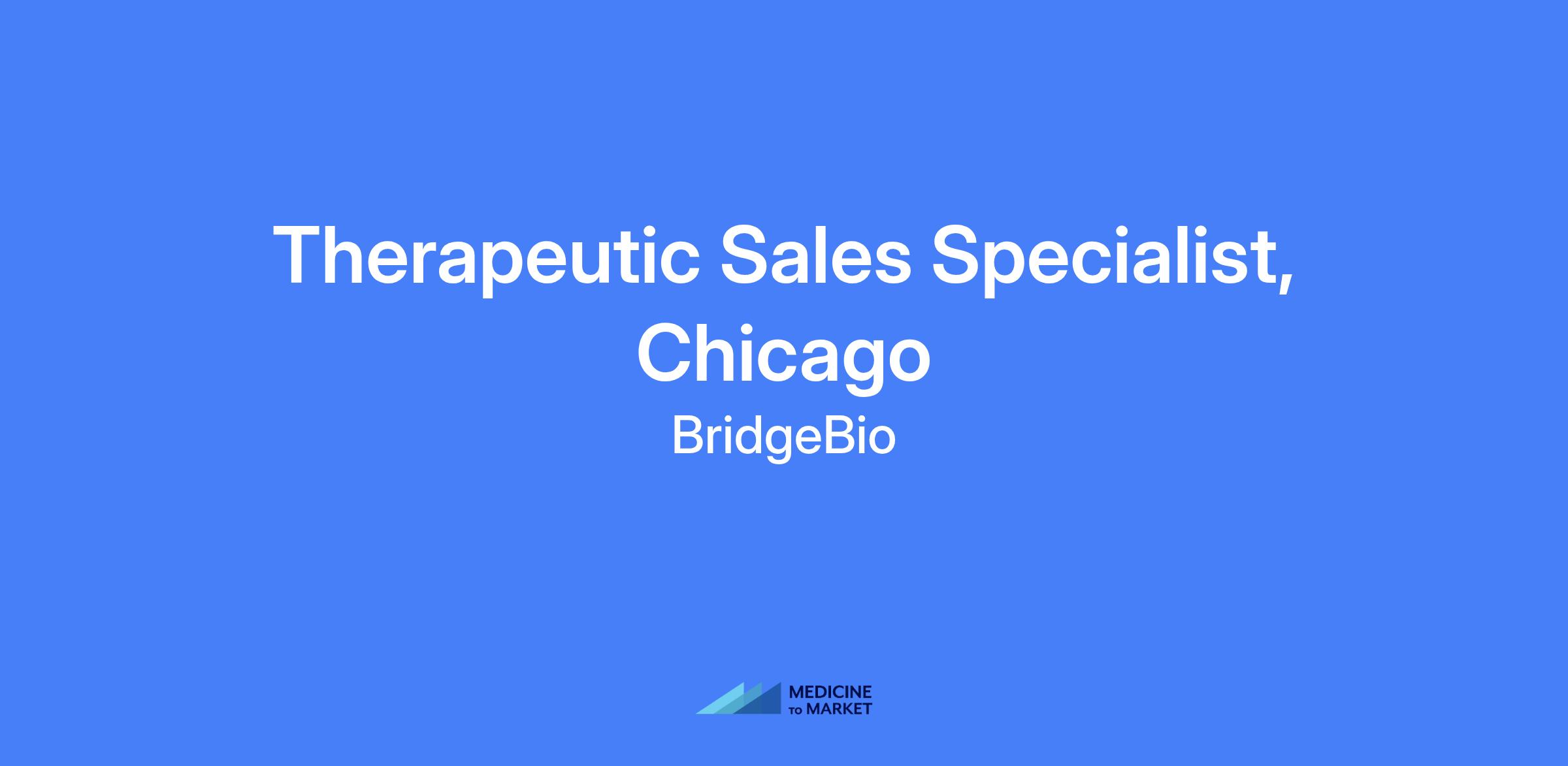 The Therapeutic Sales Specialist (Chicago, field-based) is a high-impact role critical to BridgeBioโรรดs success. They will be a patient champion with strong business and clinical acumen to execute product launches with sustained excellence, bringing passion, urgency, and a get-it-done attitude to addressing unmet patient needs.