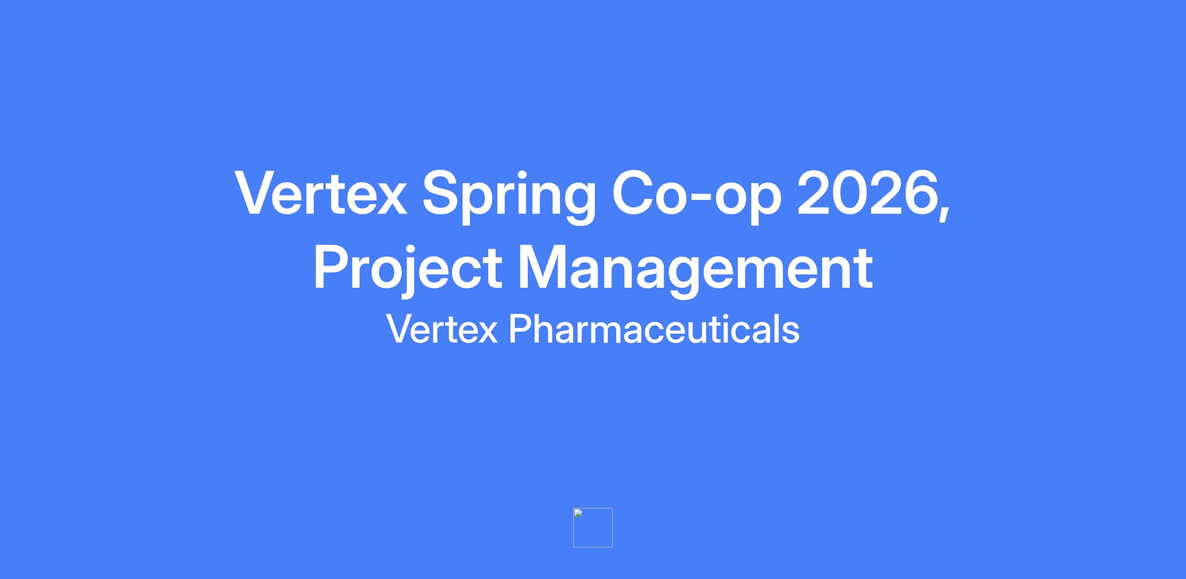 Vertex Spring Co-op 2026, Project Management β 6-month experiential co-op focusing on project management within the Project Management and Strategy Operations organization supporting Commercial Manufacturing and Supply Chain. Opportunity to work on process optimization projects, learn from industry leaders, and launch a career in project management.