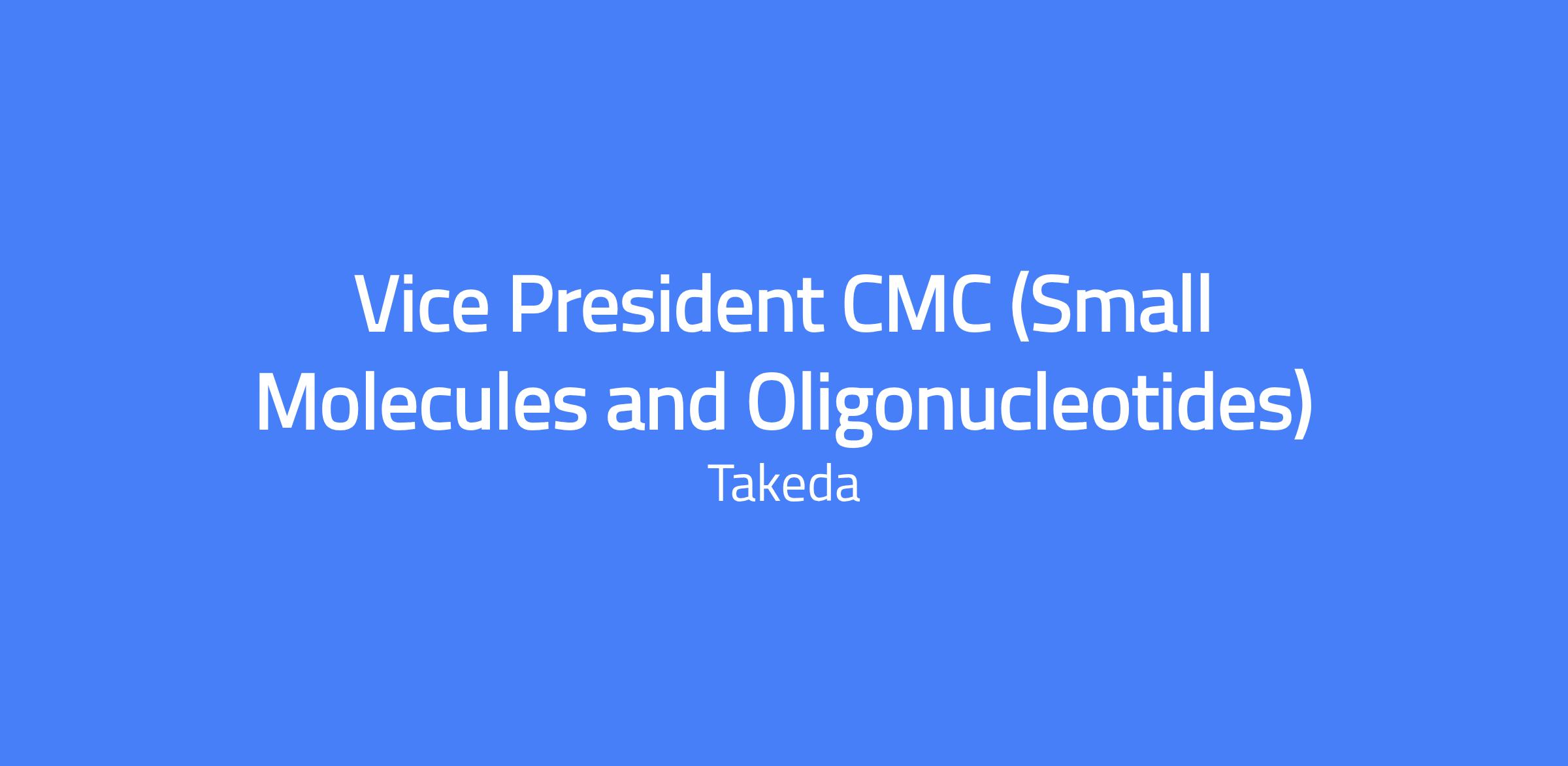 Vice President CMC (Small Molecules and Oligonucleotides) overseeing the entire Takeda portfolio for pharmaceuticals, including synthetic small molecules, synthetic peptides, and synthetic oligonucleotides. The role collaborates with Executives (VP/SVP) in R&D (Discovery and Therapeutic Area Units - TAUs), GRA, GMS, Global Quality, and Commercial. Location: Boston, MA.
