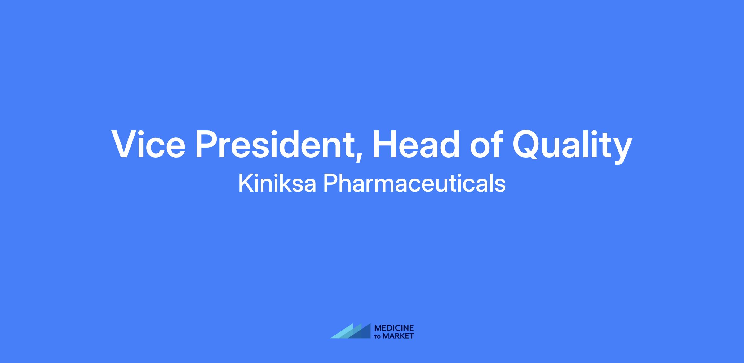 Vice President, Head of Quality. Responsible for creating, monitoring, and maintaining phase-appropriate ICH levels of compliance for all GxP activities associated with Kiniksa products, and for developing, administering, and continuously improving global quality systems to ensure regulatory compliance. Based in Lexington, MA, with in-office work five days a week and a monthly option to work from home on the last Friday.