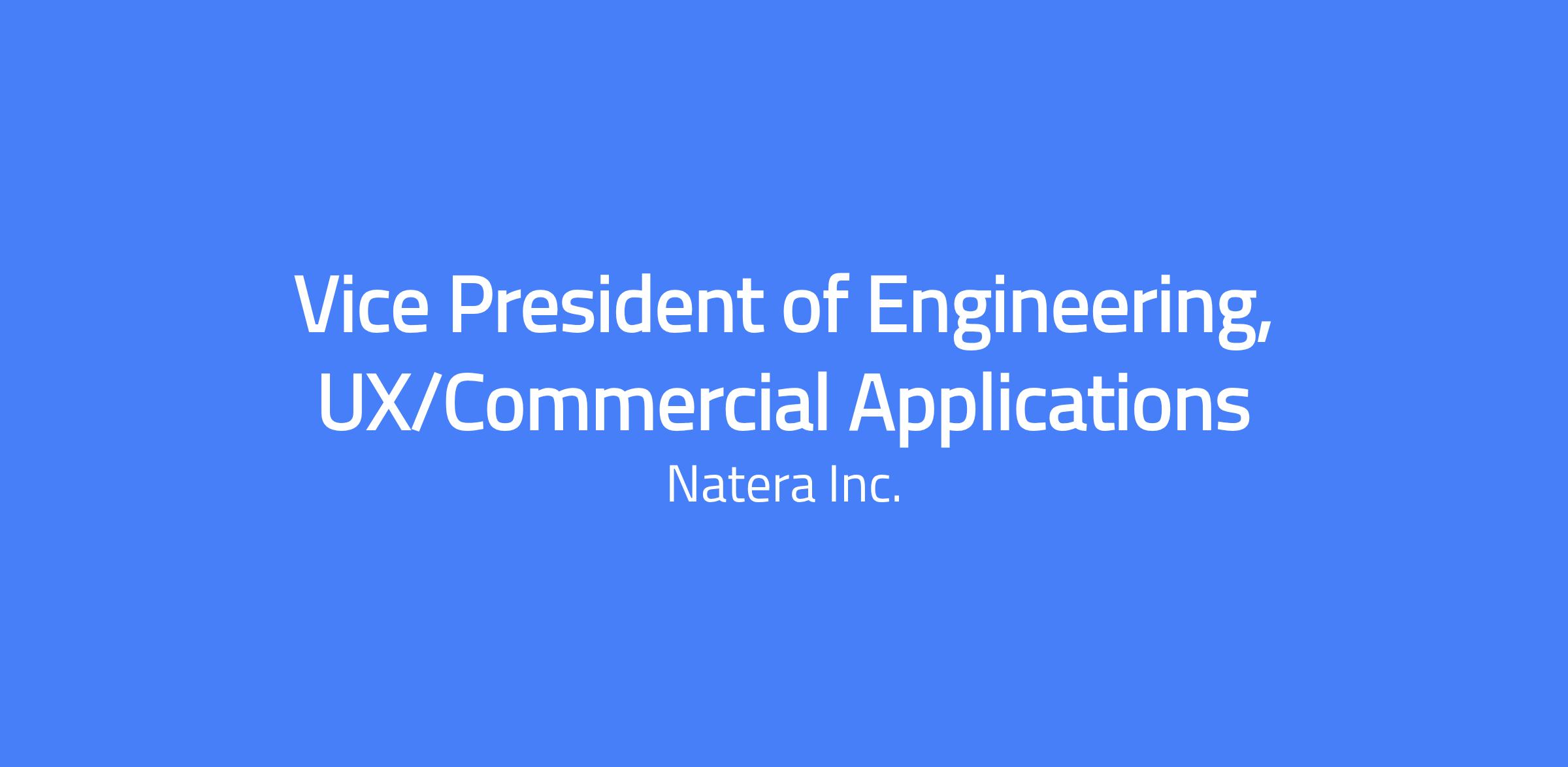 Position Summary: Natera is seeking a Vice President of Engineering, UX/Commercial Applications to lead a 100+ person engineering organization responsible for our commercial software platforms. This leader will focus on strengthening execution, raising engineering standards, and advancing AI-enabled product and development capabilities.