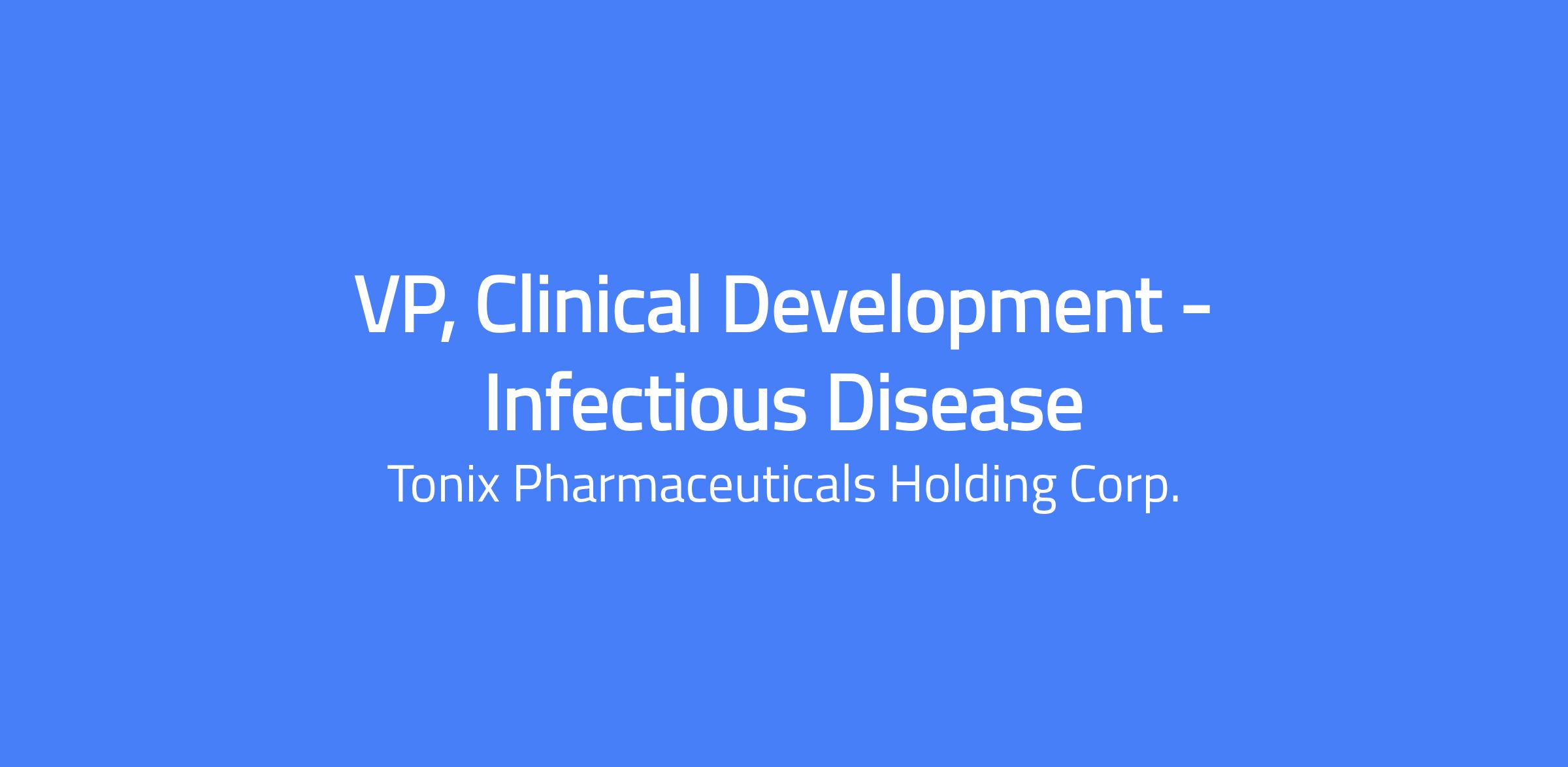 The Vice President (VP), Clinical Development - Infectious Disease is a leadership role responsible for guiding Tonix Pharmaceuticals' clinical development programs. Reporting directly into the Chief Medical Officer, this position provides strategic oversight to ensure excellence in clinical research, regulatory interactions, and product approvals within Tonix's core therapeutic area of Infectious Diseases, initially with focus on prophylactic monoclonal antibodies, live virus vaccines and Lyme disease.Â